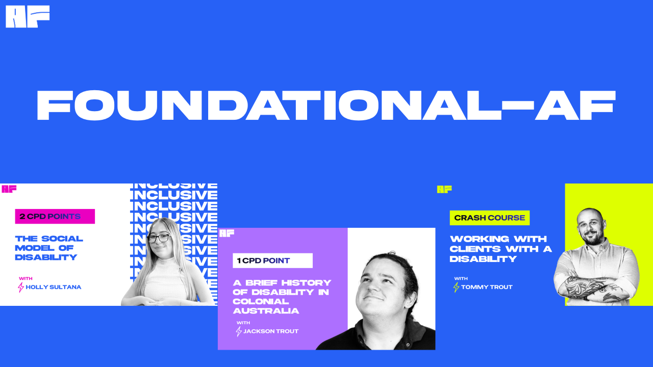 Our first course bundle! 🥹 This course bundle has all the foundational knowledge any fitness professional should have if they are considering working and engaging with disabled clients. The history and the social model are where we start when educating fitness professionals and businesses on engaging people with disability. By the end of this bundle, you'll not only have 3 CPD points but also a deeper understanding on the history and frameworks of disability supports, needs and aspirations. It's theory based so if you're a nerd who likes to deep-dive topics, you're in the right place. 3 Courses 3 CPDs A rollicking good time!
